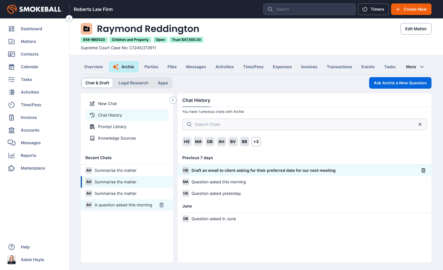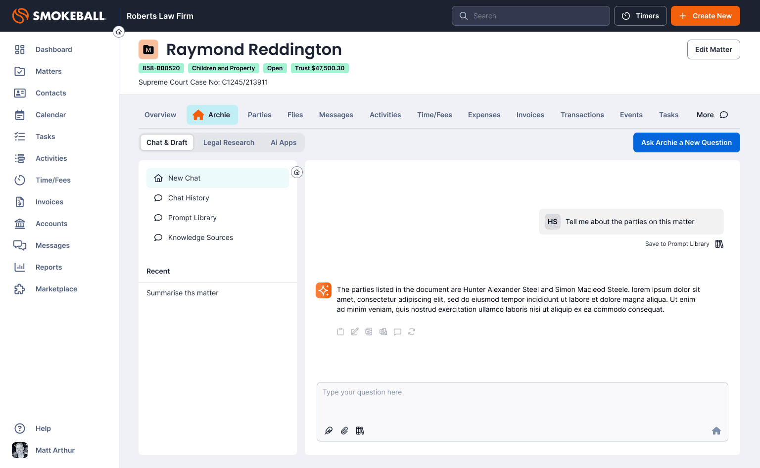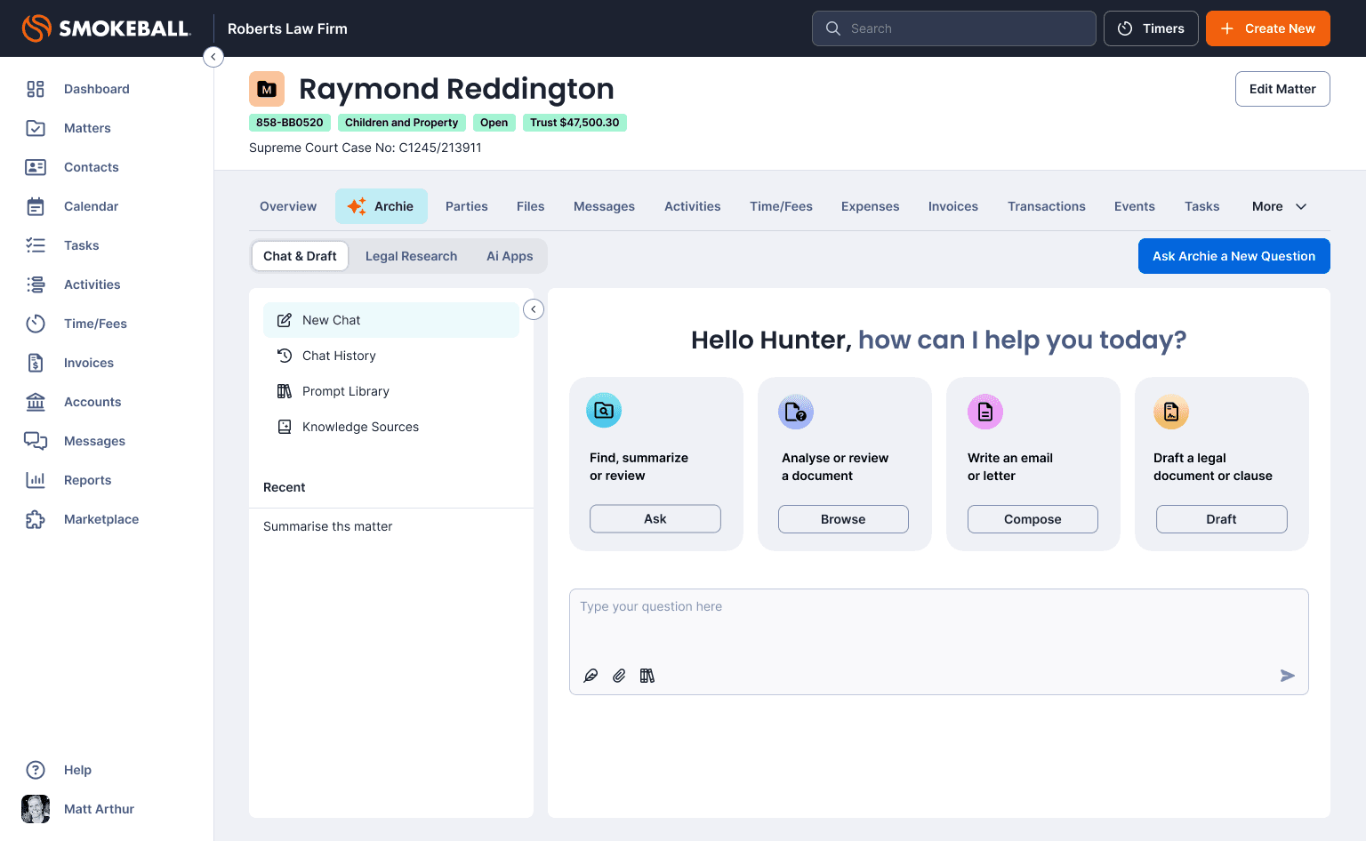 As Head of Product Design, I led the product and experience design of Archie, an AI-powered matter assistant embedded directly within Smokeball.
